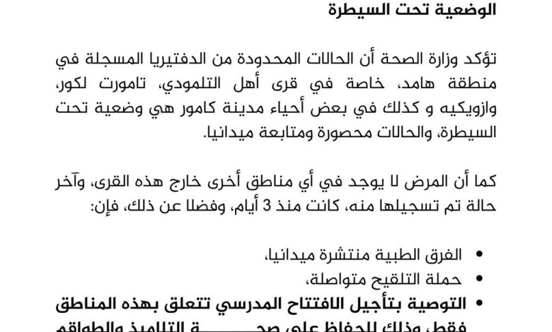 وزارة الصحة تأجل افتتاح العام الدراسي بمنطقة هامد بولاية العصابة