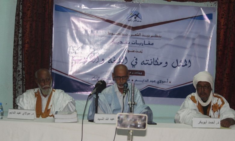 نظم بيت الشعر نواكشوط مساء اليوم الخميس ندوة من ندوات “مقاربات نقدية”، حول موضوع “المثل ومكانته في اللغة والأدب”؛ حاضر فيها كل من الأستاذ مولاي عبد الدايم و الدكتور أحمد أبو بكر الإمام، وقدم لها الأستاذ الدكتور عبد الله السيد مدير بيت الشعر.