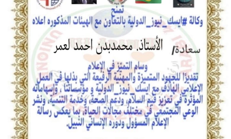 «إيسك أنيوز الدولية» بالتعاون مع هيئات إعلامية تمنح وسام التميز الإعلامي للنقيب والعميد محمد بدن أحمد لعمر