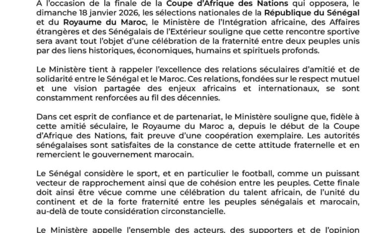 أعلنت السنغال أن نهائي كأس الأمم الإفريقية لكرة القدم، المرتقب أن يجمع بين منتخبها الوطني ونظيره المغربي “ينبغي أن يُعاش بوصفه احتفالا بالموهبة الإفريقية، ووحدة القارة، وبالأخوة الراسخة بين الشعبين السنغالي والمغربي، بعيدا عن أي اعتبارات ظرفية”.
