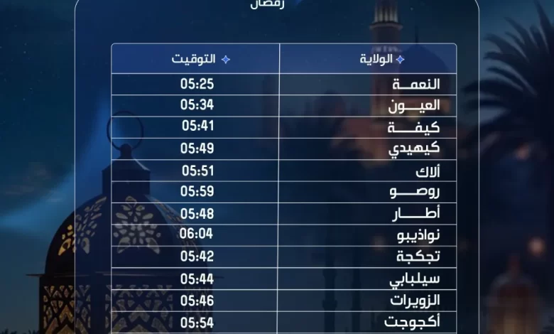 - النعمة عاصمة ولاية الحوض الشرقي وضواحيها: وقت الإمساكـ: 05:25