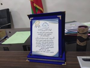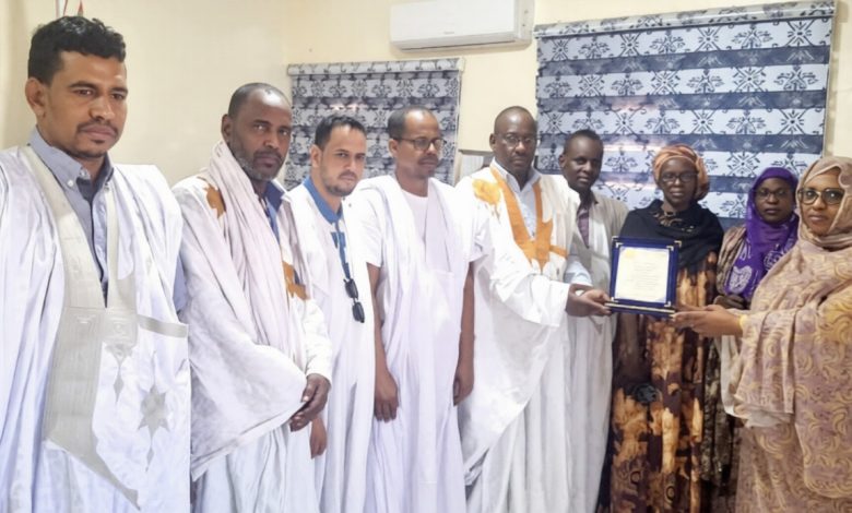 وسلم الدرع التكريمي، بإسم نقيب الصحفيين الموريتانيين السيد أحمد طالب ولد المعلوم، الكاتبة الجهوية للفرع الجهوي للنقابة على مستوى ولاية اترارزه، السيدة آسية بنت محفوظ ، مديرة محطة الإذاعة على مستوى ولايةاترارزه.