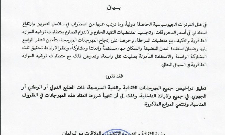 وأكدت الوزارة حرصها على إنجاح هذه المهرجانات وتمكين المدن المضيفة وسكانها من الاستفادة منها على الوجه المطلوب، بما يستوجب عادة تعبئة واسعة لوسائل النقل وضمان مشاركة كبيرة، وهو ما يتعذر في الظرف الحالي بالنظر إلى تعارضه مع مقتضيات ترشيد استهلاك الطاقة.